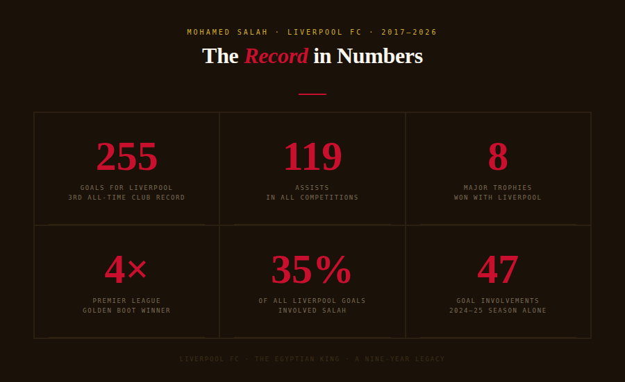 How do you quantify what a footballer means to a club? The instinct is to reach for numbers, and with Salah, the numbers are staggering enough to stop you in your tracks. But the truth is that statistics - however extraordinary, have never been able to hold the full weight of what he has meant. You can recite the records until your voice gives out, and you still won’t have captured the feeling of watching him receive the ball on the right flank, cut inside onto his left foot, and know - know - before the shot had even left his boot, that it was going in.