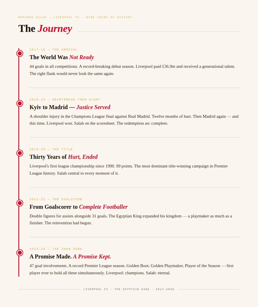 The lazy version of the Mohamed Salah story is purely the goals. The debut season fireworks. The 32 Premier League goals that broke the record in 2017–18. The hat-tricks, the thunderbolts, the penalties dispatched with the cold efficiency of a man utterly at peace with himself in the biggest moments. All of that is real, and all of it is extraordinary.